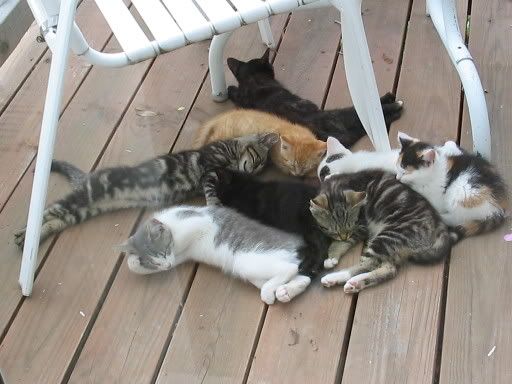 Clockwise starting from the top black one: Blackie, Snowball, Callie, Obi-Wan, Coal, Daisy, Anakin, and Ares.